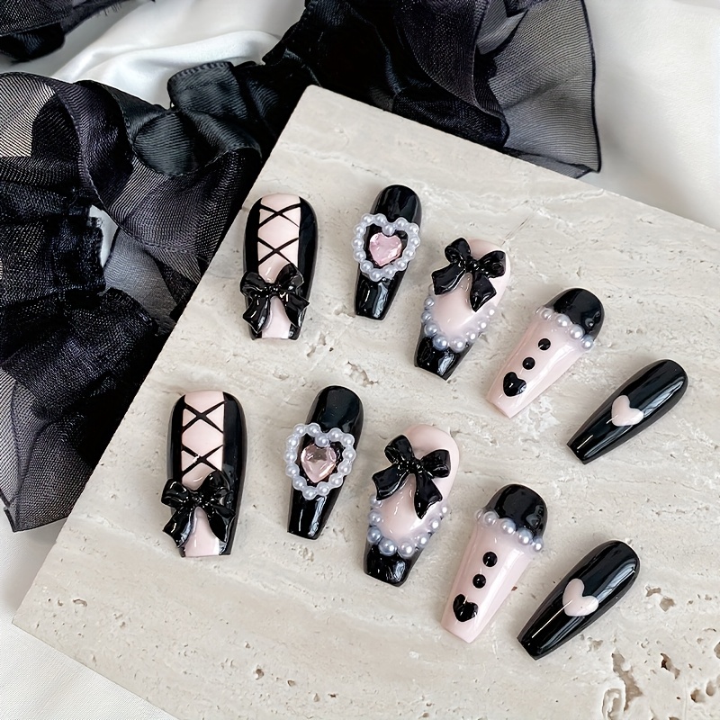 TEMU 여성용 핫 걸 에스테틱 핸드메이드 Y2K 프레스온 네일 10개 세트 - 롱 코핀 매트 인조네일, 3D 리본 & 하트 장식, 핑크 & 블랙 옴브레 디자인