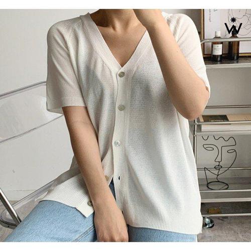 [옷자락]여자 썸머 린넨 데일리 보석 단추 브이넥 반팔 가디건
