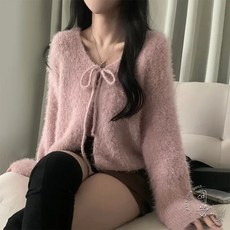 예쁨시전 부클 앙고라 큐티 리본 브이넥 볼레로 니트 가디건