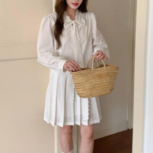 [옷자락]여자 리본 레이스 스트링 플리츠 셔츠 미니 원피스