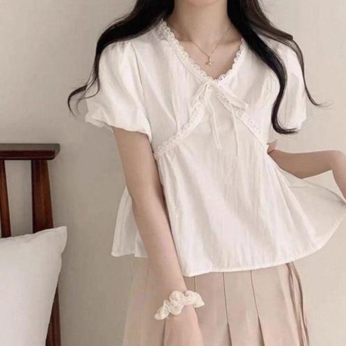 [위시드]레이스 포인트 리본 스트링 반팔 블라우스 (WICABL045)