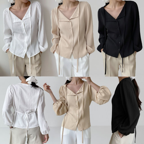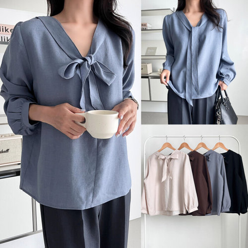 플린 리본 타이 셔츠형 블라우스 2종세트