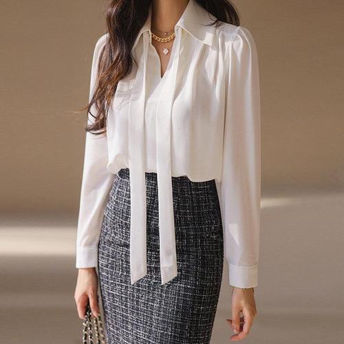 여성용 시크 긴팔 버튼업 블라우스 패션 리본 셔츠 스타일리시 여성 상의