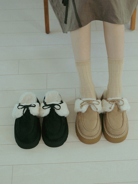 신난다슈 여성 블로퍼 1cm 여자 방한 리본 뮬 털 슬리퍼 퍼 스웨이드 GDR253096