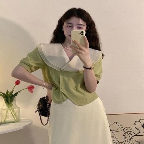 더블 레이스 빅카라 쉬폰 소재 재킷형 여름 블라우스