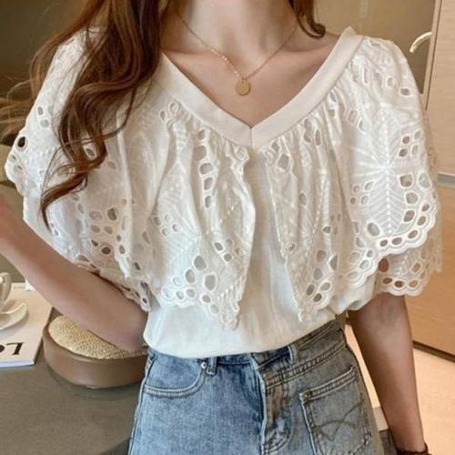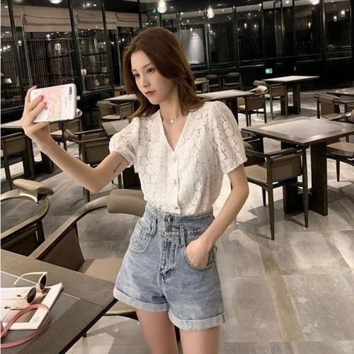 [엄지척]여성 여름 귀여운 브이넥 레이스 반팔 블라우스_19659271_667501