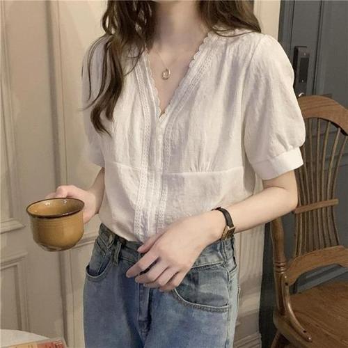 [엄지척]화이트 브이넥 레이스 면 반팔 블라우스 여름 시원한_19645854_667501