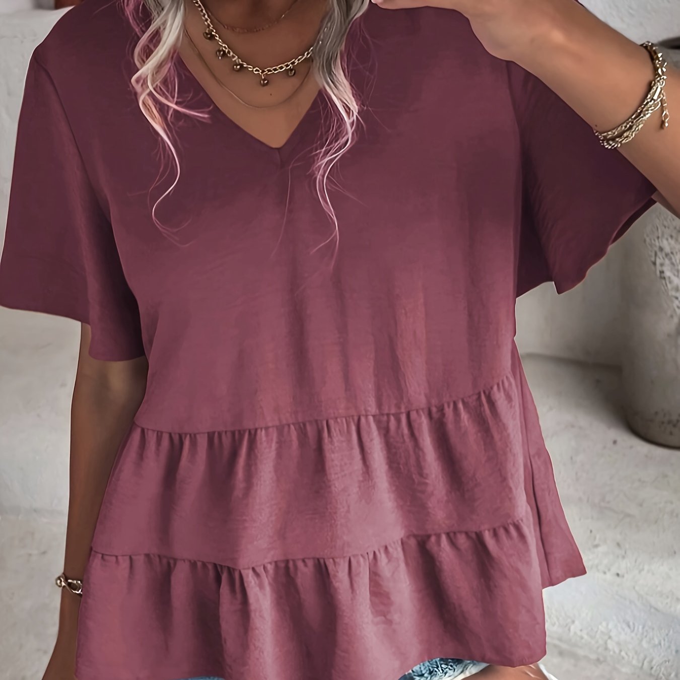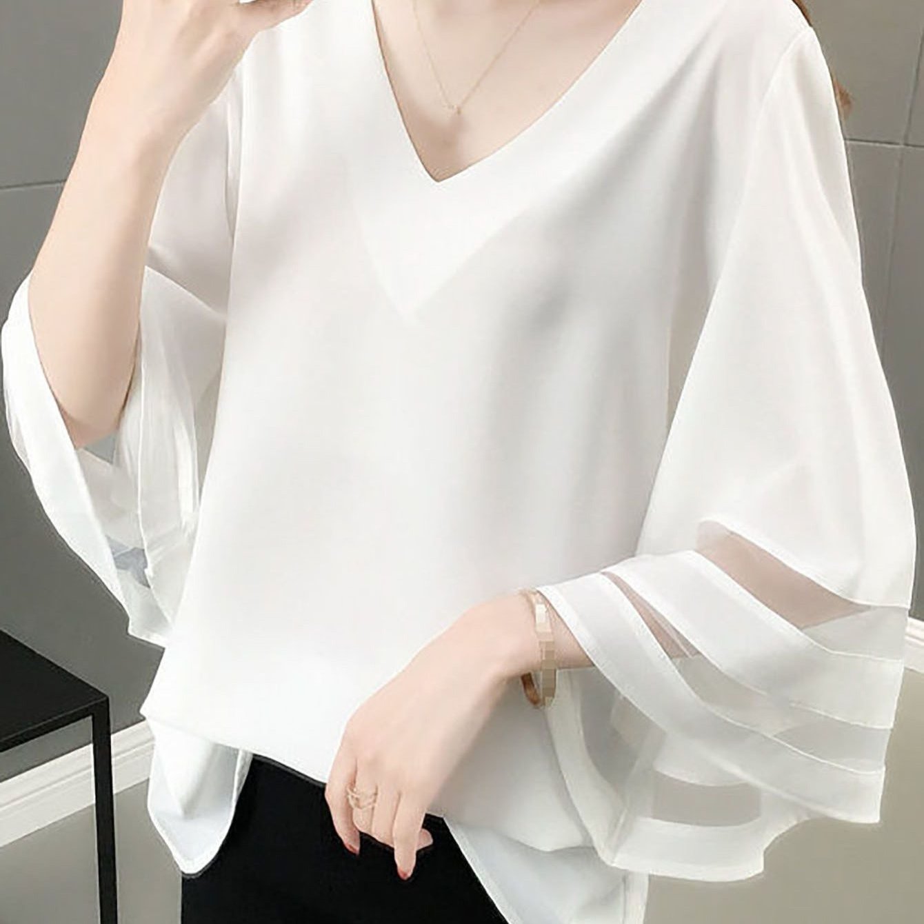 TEMU 여성용 드레스 블라우스 V넥 더블 레이어 탄성 메쉬 캐주얼 플로우 워크 셔츠 러플 3/4 플레어 슬리브 투니 탑