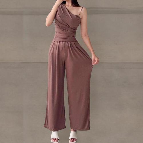 [신상오픈런]여성 리조트룩 언발란스 슬림 셔링 나시 찰랑핏 바지 세트