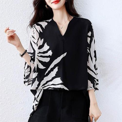 [신상오픈런]여성 휴양지 패션 리프 라운드넥 대형 블라우스
