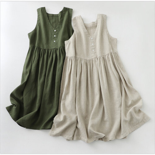 ANYOU 여름옷 신상 심플 루즈핏 민소매 나시 롱스커트 스타일 면 린넨 무릎까지 오는 원피스 여