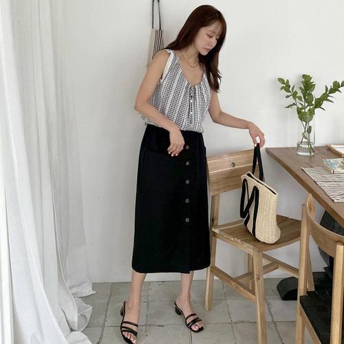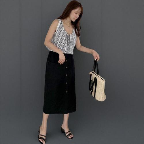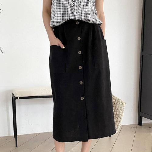 [옷자락]여성 클래식 린넨 소프트 무지 단추 롱 스커트