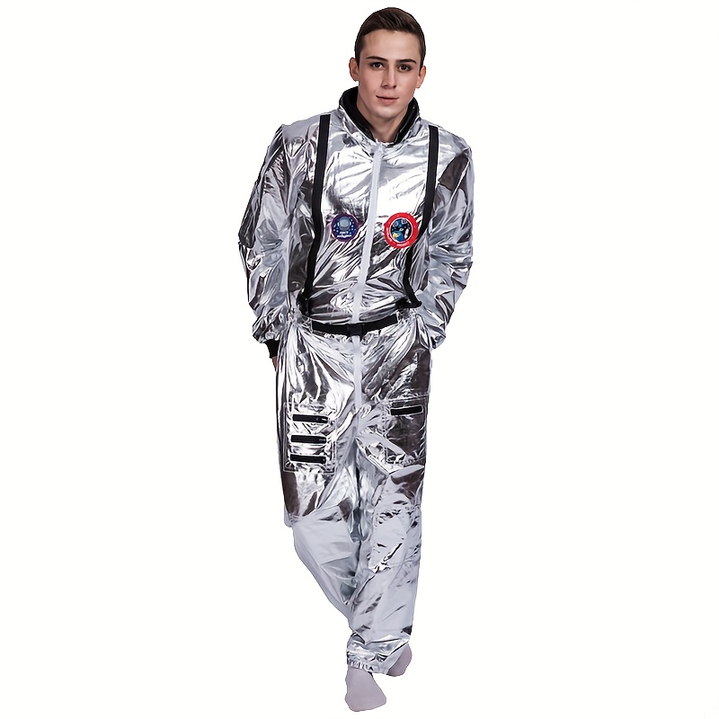 TEMU 남성용 우주비행사 의상 - 은빛 우주복, 빨간색 & 파란색 패치, 검은색 스트랩, 그리고 할로윈, 코스프레, 또는 테마 파티용 골든 악센트, 코스프레 의상 | 스트리트 스타일 의상 | 내구성 있는 의상, 할로윈 의상