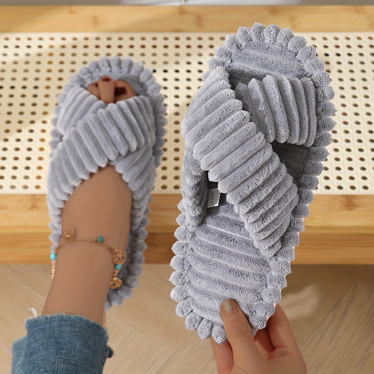 TEMU 우아한 플러시 슬리퍼 수직 크로스 디자인 - 부드러운 패브릭 갑피 & 쿠션 EVA 밑창, 사계절 실내/외부 편안함 여성용, 인도어 슬리퍼, 크로스 패턴, 소프트 텍스처