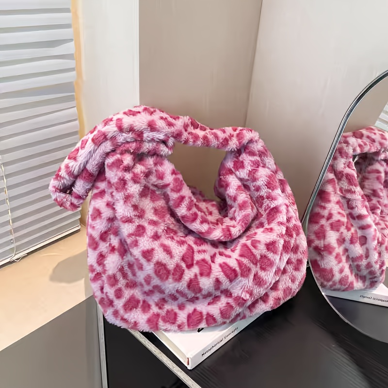 TEMU 여성용 인조 모피 크로스바디 백, 고정 스트랩 - 핑크 & 브라운/베이지 프린트 핸드백, 부드러운 지퍼 잠금, 골드 톤 하드웨어, 캐주얼 데일리 지갑 (관리 불필요), 지갑, 여성용 소형 지갑 및 핸드백, 여성용 지갑