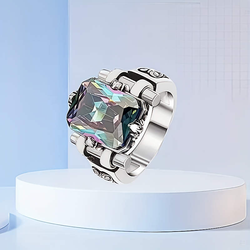 TEMU 남성용 레트로 스퀘어 인레이 멀티컬러 스톤 반지, 패셔너블 실버 메탈 조각 무늬