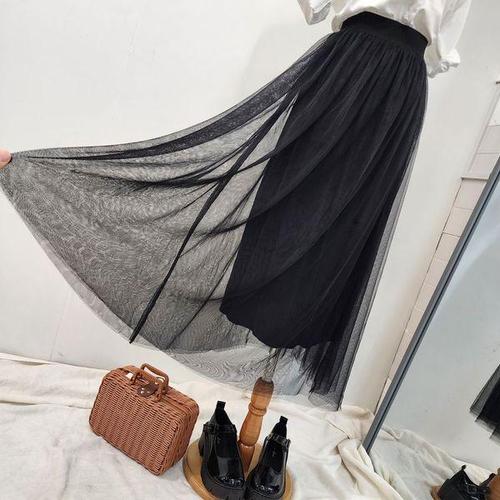 마쿠쿠 1+1 세트 메쉬 무지 여성 레이스 플레어 A라인 롱 스커트 치마