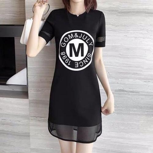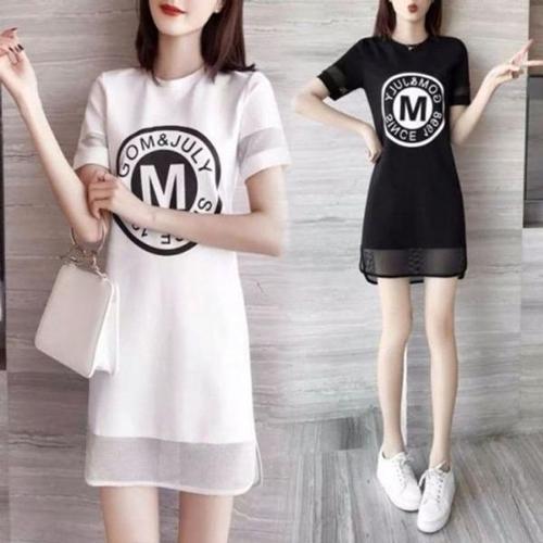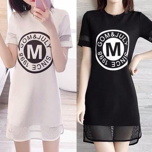 [엄지척]영문 프린팅 포인트 소매 밑단 망사 날씬핏 원피스_19951622_667501