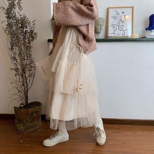 [엄지척]옆 리본 끈 롱 기장 망사 3단 레이스 스커트_19950668_667501