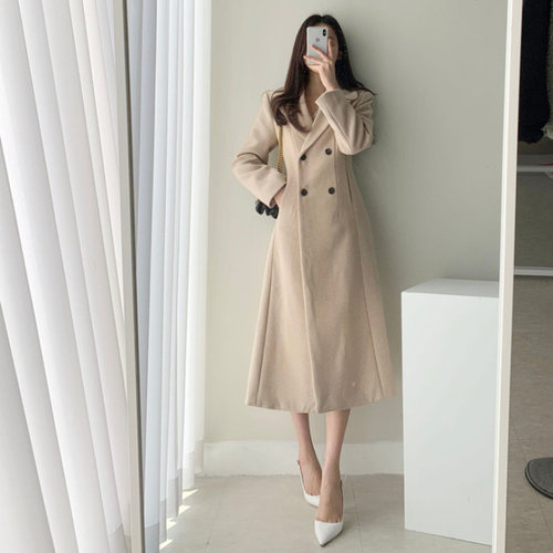 워너비뮤즈 / A라인 롱 슬림 플레어 더블 버튼 울코트 블랙 베이지