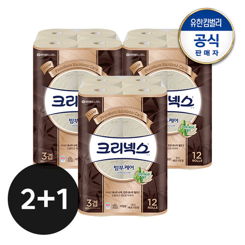[유한킴벌리]크리넥스 3겹 천연펄프 밤부케어 롤화장지 25MX12롤X2팩+1팩(총3팩)