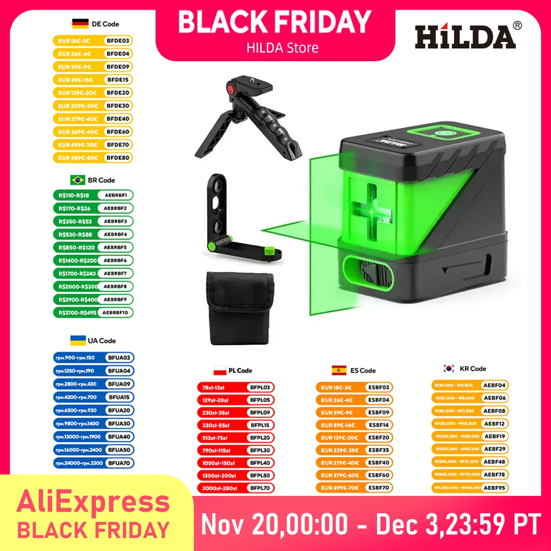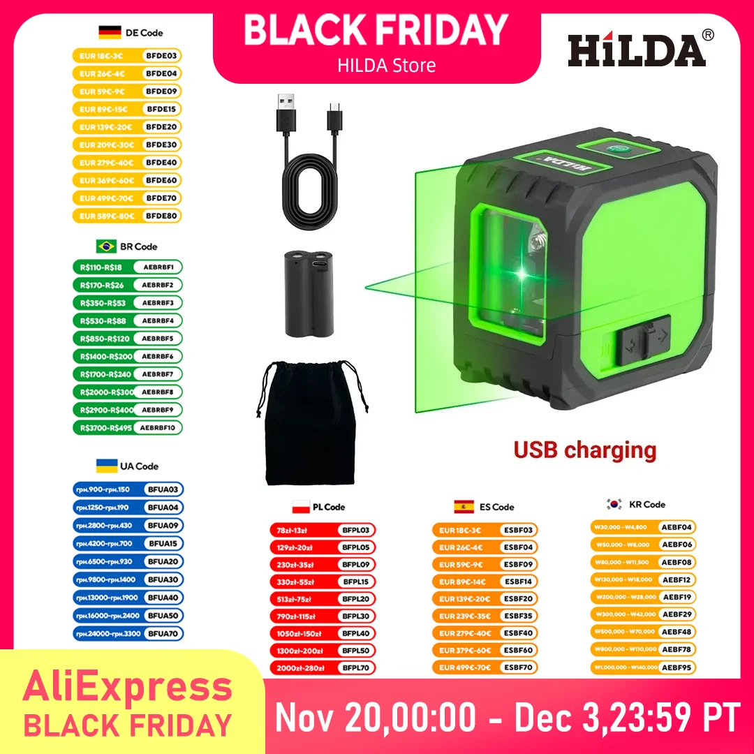 HILDA 2 라인 레이저 레벨 셀프 레벨링 녹색 빔 레이저 수평 수직 크로스 라인 미니 레이저 레벨