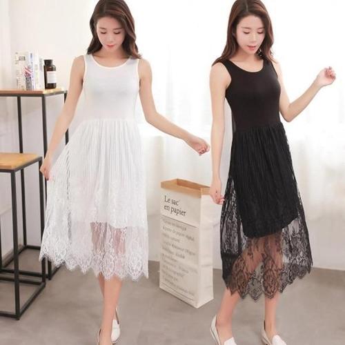 [옷자락]여성 레이스 메쉬 레이어드 민소매 롱 드레스
