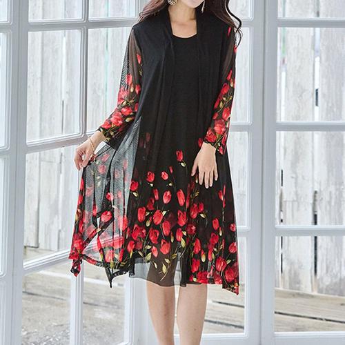 [까르죠아]까르죠아 플라워 민소매 원피스 롱 가디건 세트 2종 앙상블 여름 망사 매쉬 자켓 중년여자옷
