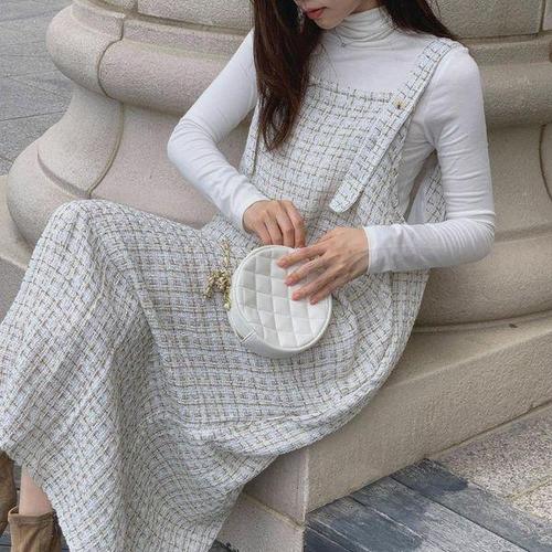 [신상오픈런]여성 트위드 멜빵 롱 원피스 핀턱 플레어 스타일