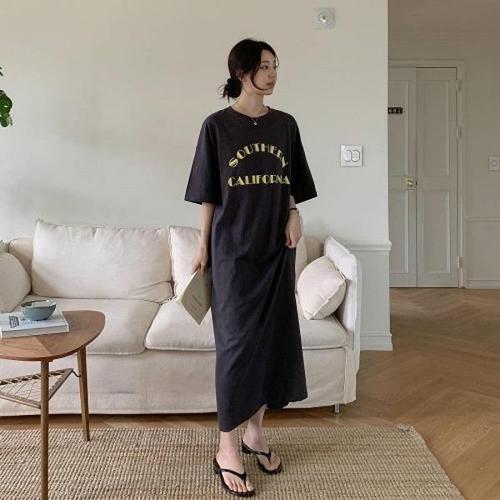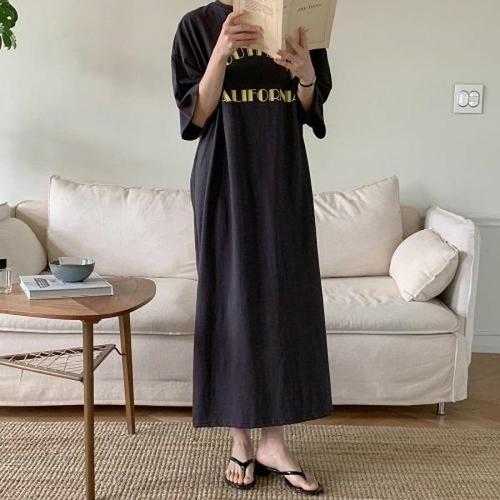 [옷자락]여성 데일리 레터링 롱 코튼 반팔 원피스