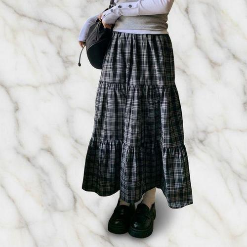 [신상오픈런]여성 체크 패턴 자연스러운 일상용 면 롱스커트
