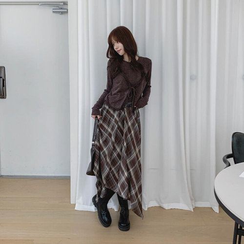 [옷자락] 여자 키치무드 코튼 격자체크 벨티드 언발 롱 스커트