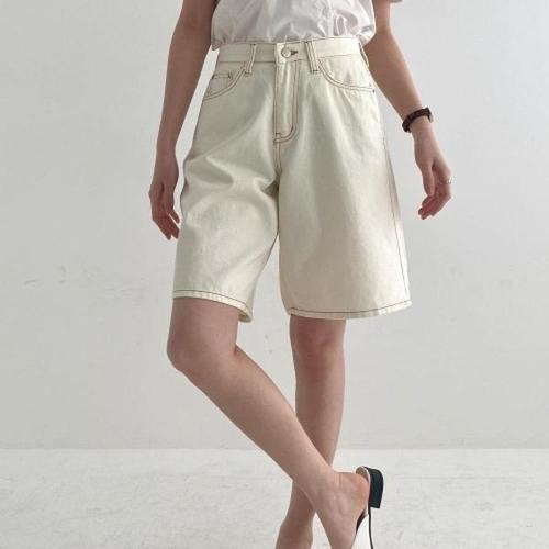 벨트무료 여성 봄여름 MRDIA-WHIP 고탄력 면스판 오버올 솔리드 하이웨스트 레그 반바지 3칼라