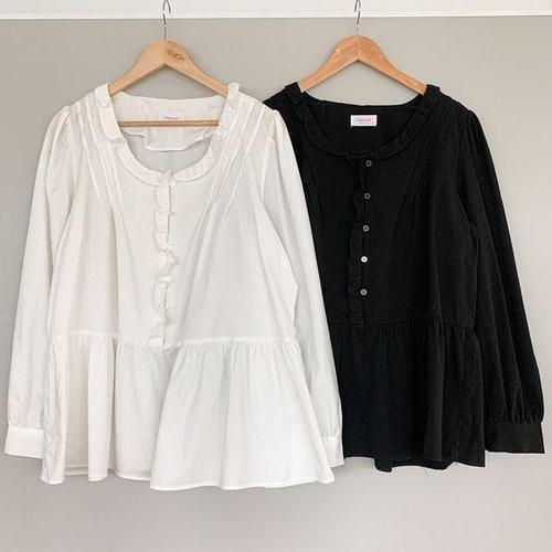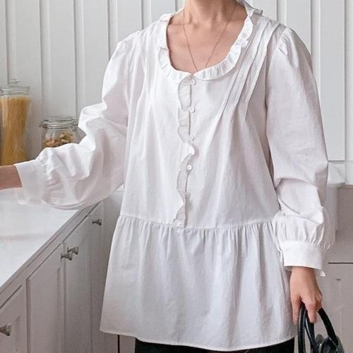 [다잇템]여성 FW 벌룬 U넥 큰사이즈 코튼 프릴 블라우스