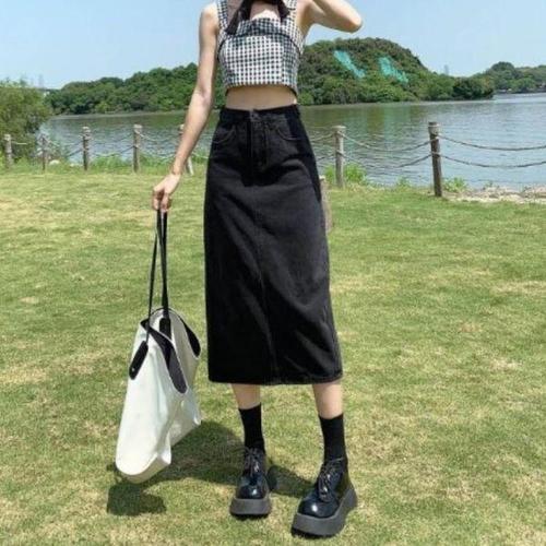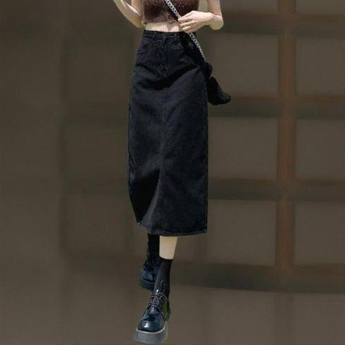 [신상오픈런]여성 캐주얼 면혼합 블랙 롱 스커트 뒷트임