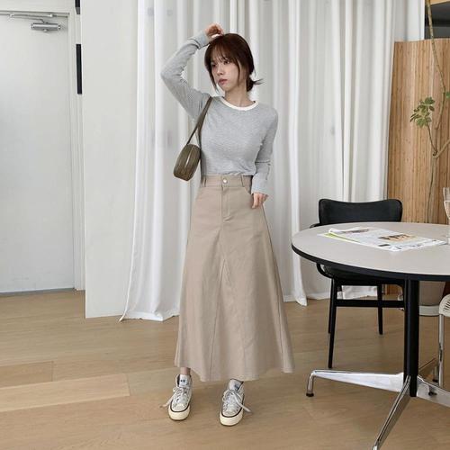 [옷자락] 여성 클래식 탄탄면 절개 A라인 롱스커트