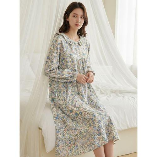 [다잇템_패션]여성 면원단 패턴 에이라인 잠옷 롱 원피스