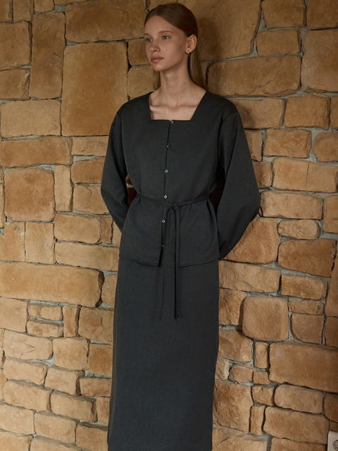 [주르티] [세트] 모니카 스퀘어넥 스트랩 블라우스 + 모니카 백슬릿 스커트 차콜 J1836