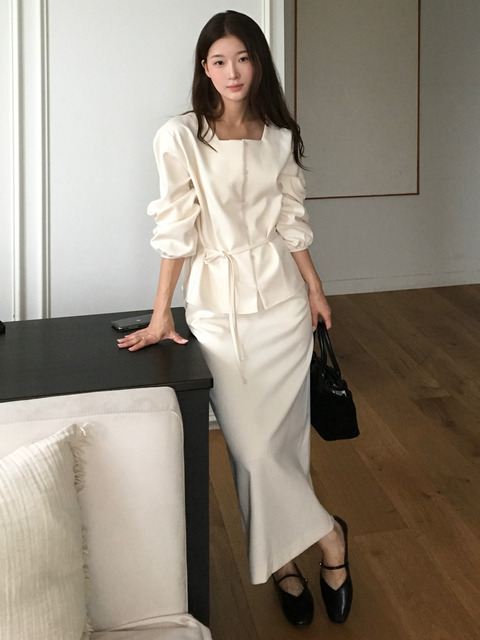 [주르티] [세트] 모니카 스퀘어넥 스트랩 블라우스 + 모니카 백슬릿 스커트 크림 J1835