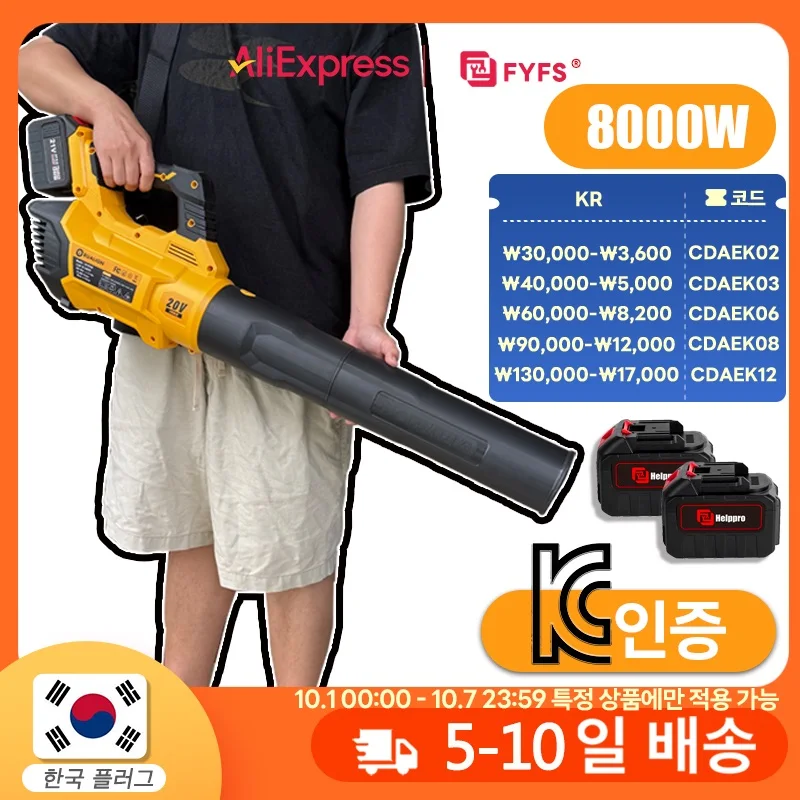 FYFS 산업용 8000W 충전식 캐논 블로워 무선 잎 블로워 초강력 무선 에어 블로워 정원용(15셀 배터리 2개, 2A 한국 플러그)