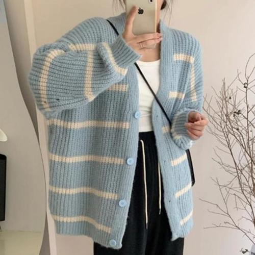 [HYIJDMKD_4B]니트 브이넥 롱가디건 가로 스트라이프 모던
