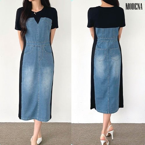 [H2. 모데나] ★신상특가★양면 데님 배색 반팔 원피스