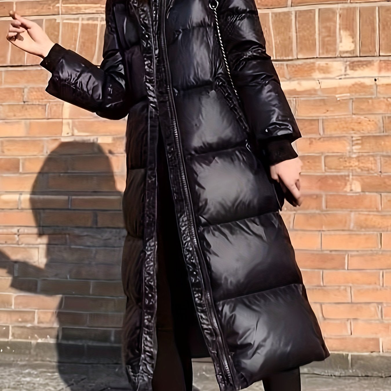 TEMU 여성용 새로운 두꺼운 겨울 긴 블랙 코트, 반짝이는 루즈핏, 트렌디한 아우터.