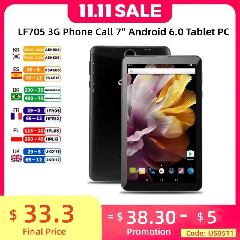 LF705 3G 전화 통화, 안드로이드 6.0 태블릿 PC, 쿼드 코어, 2GB RAM, 16GB ROM, MTK8735, 1024x600 픽셀, 2 x SIM 카드, 7 인치
