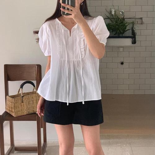 [모어오브]베카 반팔 블라우스 스트링 프릴 탑