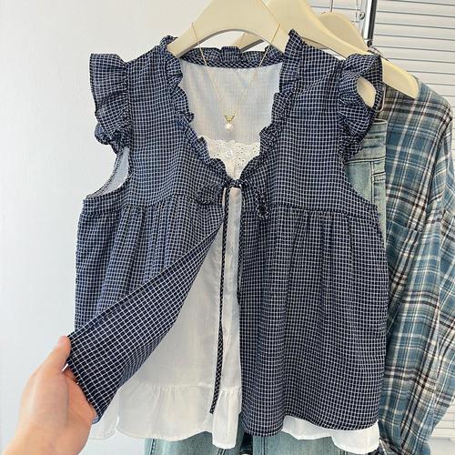 [모어오브]콜즈 체크 나시 블라우스 프릴 탑