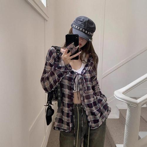 [모어오브]프랄린 체크 셔츠 프릴 긴팔 남방 탑