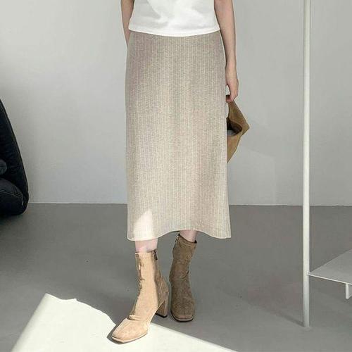 [옷자락]여자 모직 탄탄 줄지 h라인 트임 롱 스커트