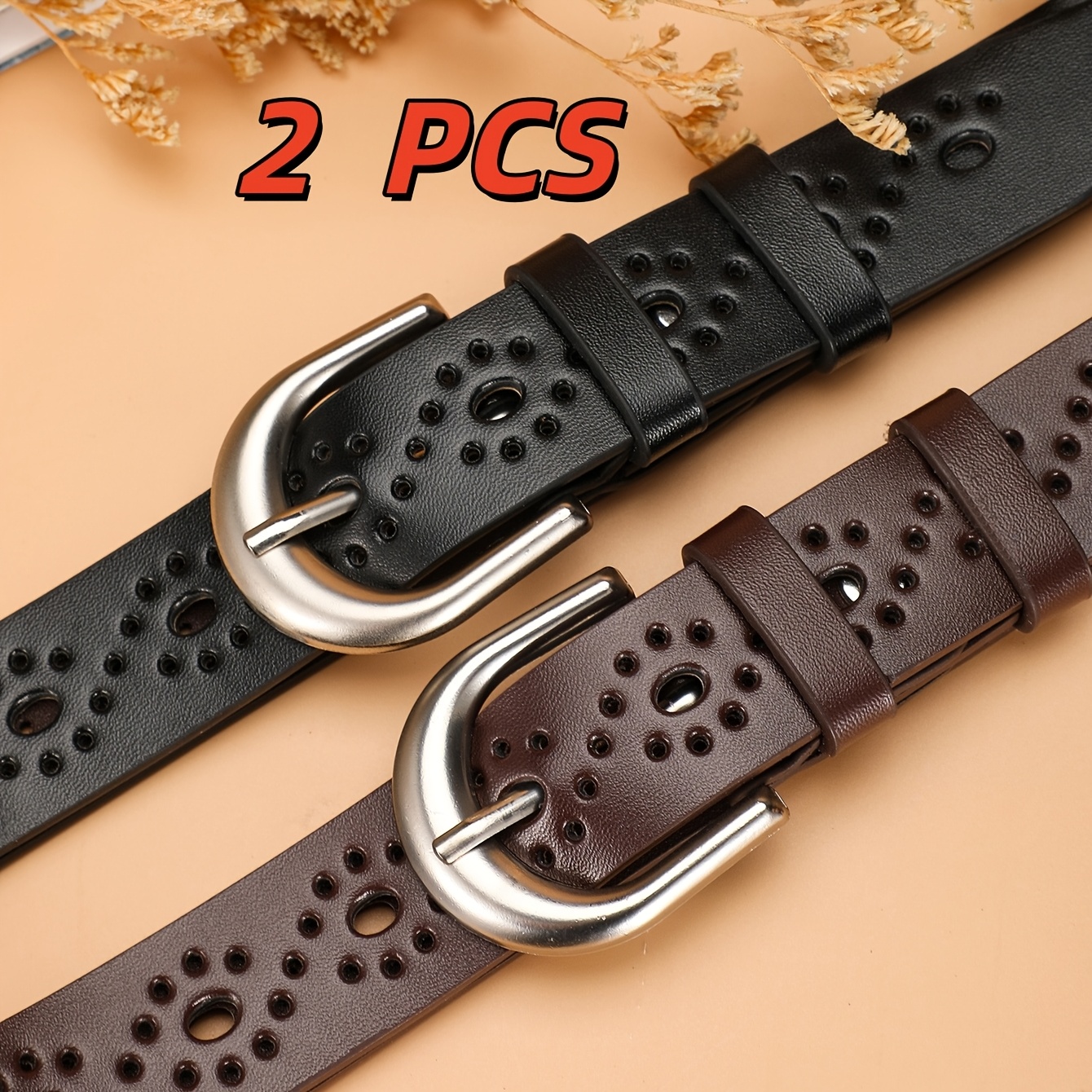 TEMU 2개입 대형 PU 벨트, 속이 빈 S자형 | 스타일, 속이 빈 디자인, 고급스러운 원형 메탈 버클 (블랙 & 브라운), 캐주얼 및 데일리 출퇴근용