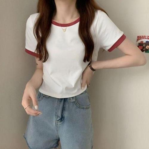 [에이치플러스몰]배색 크롭 무지 반팔티